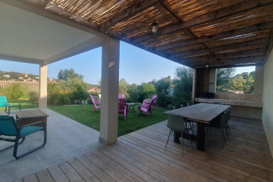 une belle terrasse couverte pour prendre vos repas et vous prélasser sur les chaises longues.
