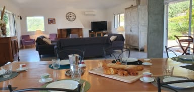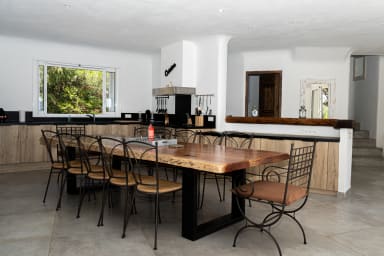 elle comprend un grand salon , une cuisine ouverte toute équipée, une table avec chaises pour vos repas,